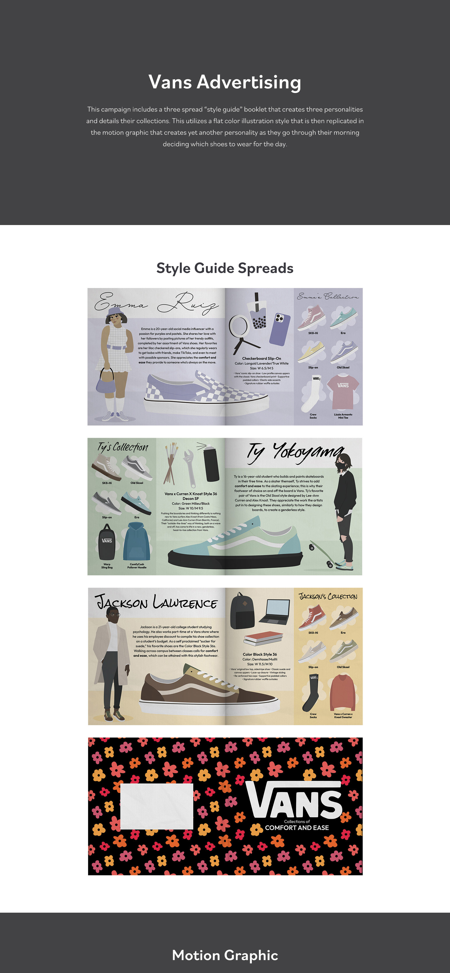 Solution: Creating multiple personalities Illustrated in a flat color style, detailing their lifestyle and items that they own; going through the process of a character picking out their shoes for the day through a motion graphic in the same illutration style
